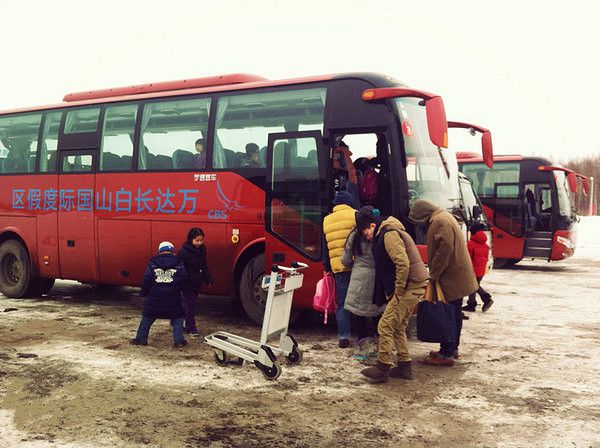 从机场出来之后,门口就有这些大巴可以送你直达要去的酒店。我们预定的是万达假日套房酒店,找到相应的巴士,就可以上车了。车上有很多带着全家老少来度假的夫妻,想来现在人们度假的方式已经不仅仅是去三亚或者泰国的海岛享受阳光了,来冰天雪地的长白山滑雪也是不错的选择。