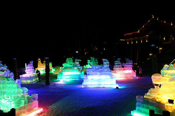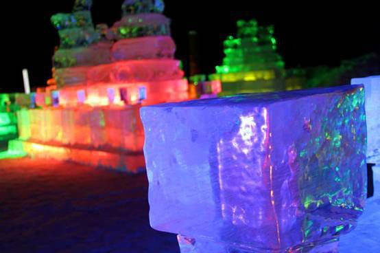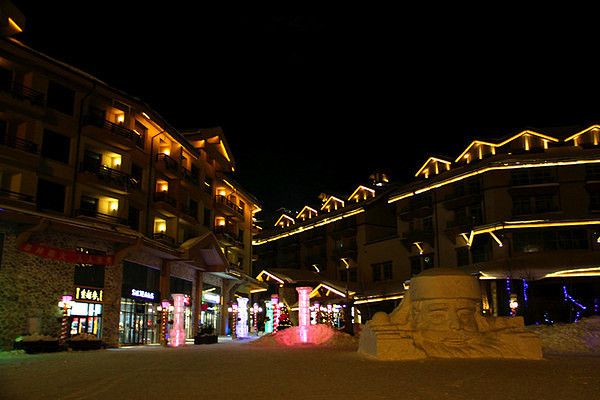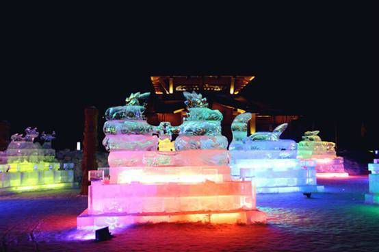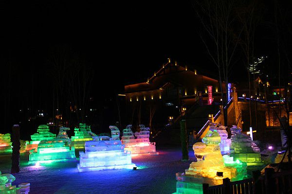 回到度假村里已经入夜了。冻了整整一天身体觉得很累,脚也开始冷的发麻,坐在大巴上恹恹欲睡。下车后见到酒店前面的冰雕亮起了彩灯,兴奋劲又上来了,蹦跳着去拍照。