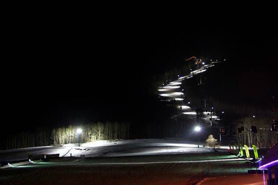 这是长白山的中级雪道,在夜色里看起来静谧又神秘。 山脚下有施工人员在连夜铺平雪路,叮叮当当的声音回荡。