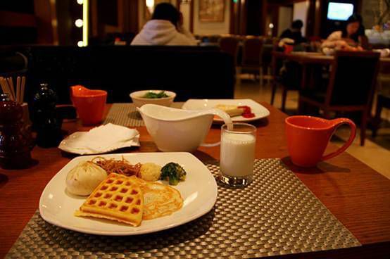 在套房度假酒店里入住,早晨要走到隔壁的万达酒店里吃早餐。路途不远,3,5分钟就可到达。早餐品种还算丰富, 七点整餐厅里已经坐了一半人, 想来大家的滑雪热情高涨。