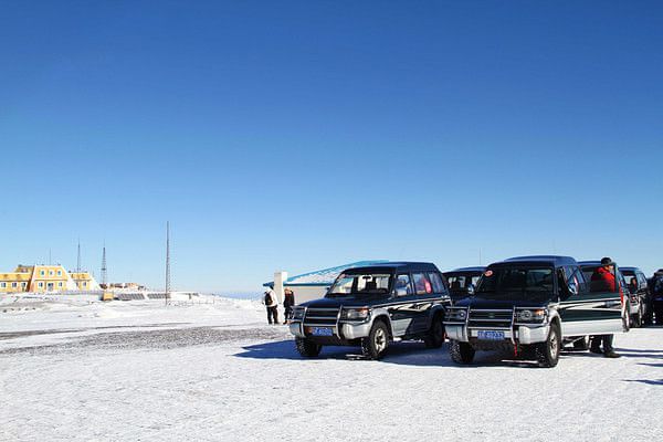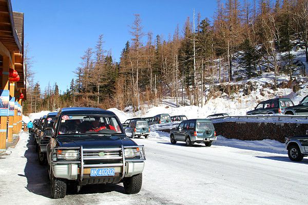 这条是通往长白山天池的道路,越野车开了近20分钟到达了山顶,一路上都是狭窄的盘山公路司机把车开的快飞起来特别过瘾。 这天天气特别好,远眺雪山也没有云雾缭绕。 司机大哥在前面说着,长白山好多年都没有这样的好天气了~这让整车人都显得极其兴奋。希望真的能如司机所说的那样,看到天池的全貌。