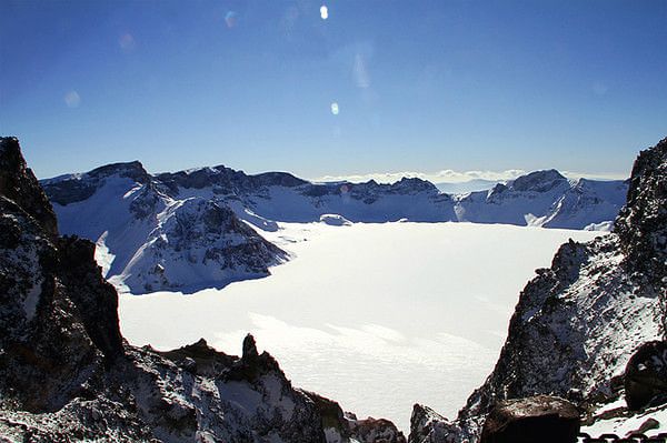 终于如愿以偿。 站在这儿天池清晰可见,像揭开了面纱的少女。 这天所有的人都很兴奋, 甚至有游客脱光了衣服,光着上身向天池呐喊致敬。从前总是在照片上见到波光粼粼的夏日天池之景, 没想到冬天的天池也是别有韵味。巨大的湖面像一面镜子镶嵌在雪山之中,高原的阳光恰到好处地掉落在这里,反射出耀眼的金色。我们笑的很开心,拉着手上蹿下跳,不停按着快门。