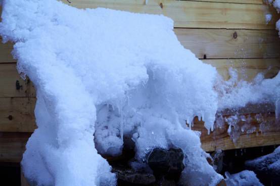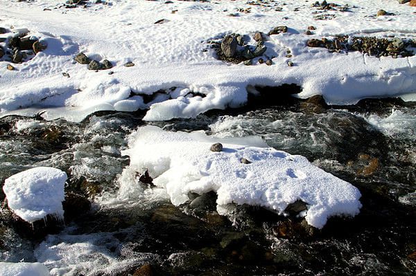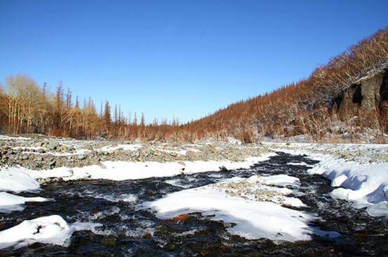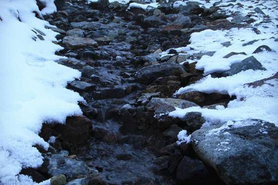 在冰雪间汩汩流淌着的温泉水,水温很高还冒着热气。