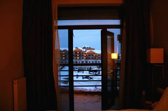 拉开落地窗帘,能看到白皑皑的雪景和迷人的长白小镇全景。