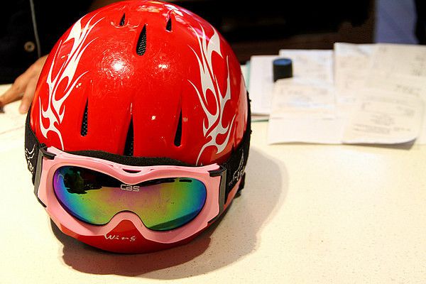 刚刚拿到的滑雪头盔和风镜,so cool!整装待发啦。let s skiing!~