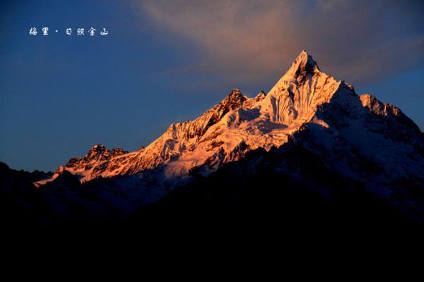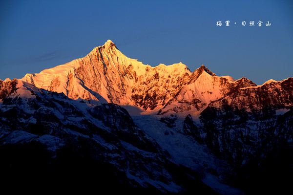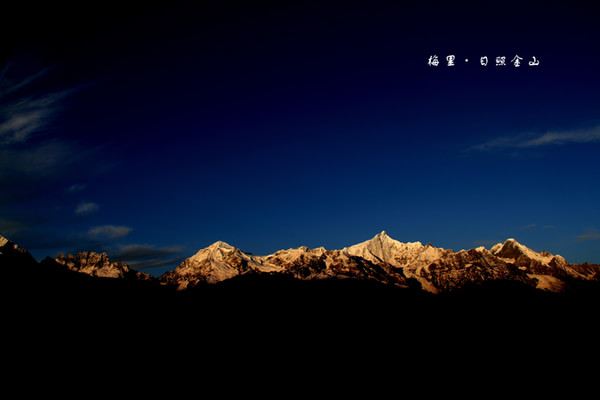 8点钟太阳渐渐散发出光辉,初时为卡瓦格博最高处披上一层微微红霞,随着时间流淌逐步倾斜下来,泛着金黄色的光芒,让这雪山形成一道璀璨的金色光带。恰巧没有云的遮挡,幸运的我们看到了名副其实的日照金山,是何等的幸运!