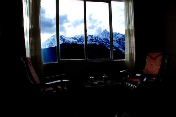 车窗外渐渐现出梅里的轮廓,梅里十三峰,尤以六座主峰最为壮观。临近傍晚到达这两日入住的酒店,在飞来寺高处很不错的位置。进入客房欣喜若狂,偌大的窗户映入眼帘的便是六座主峰,虽然有狂风吹打着窗子,不过在屋里观赏着如此美景,好不惬意。