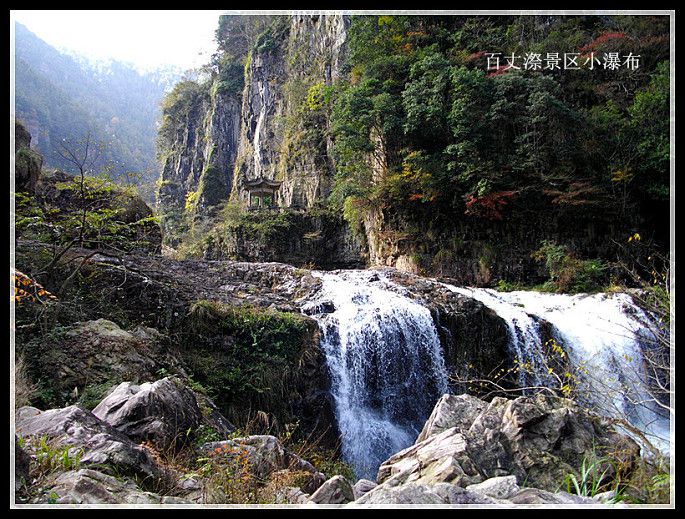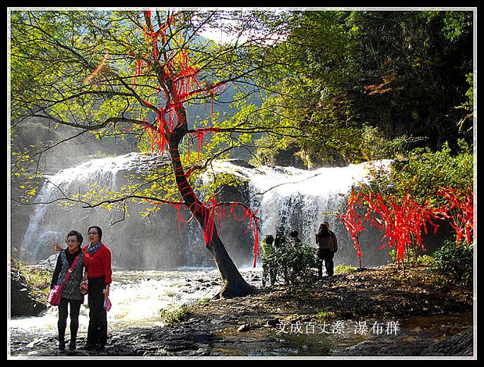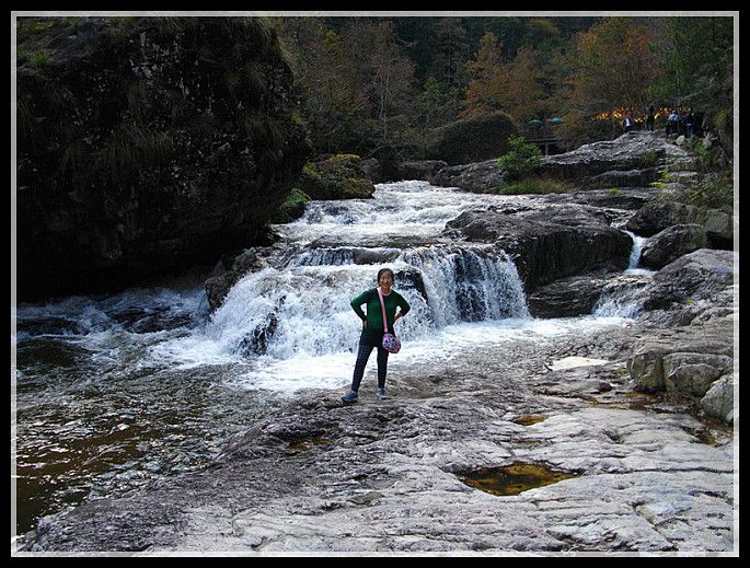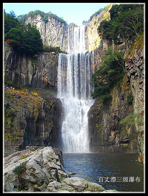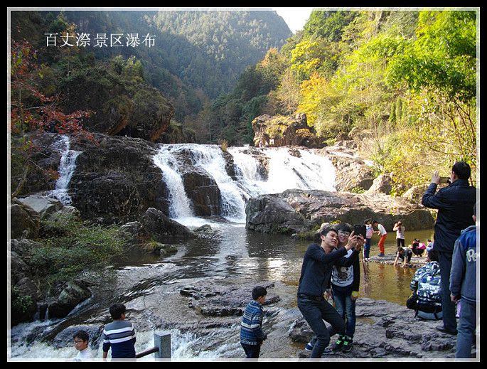 真正的百丈漈到了,百丈漈全高353米,自上而下分一漈,二漈和三级,“漈”者,“瀑”也,犹如庐山的三叠泉(三级瀑布),诸暨的五泄(五级瀑布)。其中一漈高207米,寛51米,2013年被上海大世界吉尼斯总部认证为“中国单体落差最高的瀑布”,同时入选为“中国十大名瀑”。号称“中国第一高瀑”。百丈漈的特色不仅在于高,还在于一漈“高”(雄),二漈“深”(奇),三漈“寛”(幽)。百丈漈中尤以第一漈最为绝奇,它三面绝壁如削,形成峡谷深幽豁,当激流飞泻而下时,水石相击,瀑流呼啸,气吞山河相当壮观。二漈、三级也各有特色,百丈二漈称“奇”,是因为二漈瀑布后面藏有一个天然“水帘洞”,可以容纳百余人。我们这次旅游团就有好多人越过瀑布冲进去了,特有趣!百丈三漈称“幽”,犹如长纱白练,飞落在山脚的清澈见底的碧湖中,然后,又横穿在6里秀谷之中,形成溪流和大小瀑布、清潭,与络绎不绝的游人,如诗如画的秋山合成了一幅奇妙绝伦的秋景旅游图,令**连忘返。朋友,百丈漈不可不游。