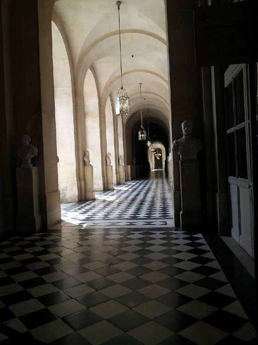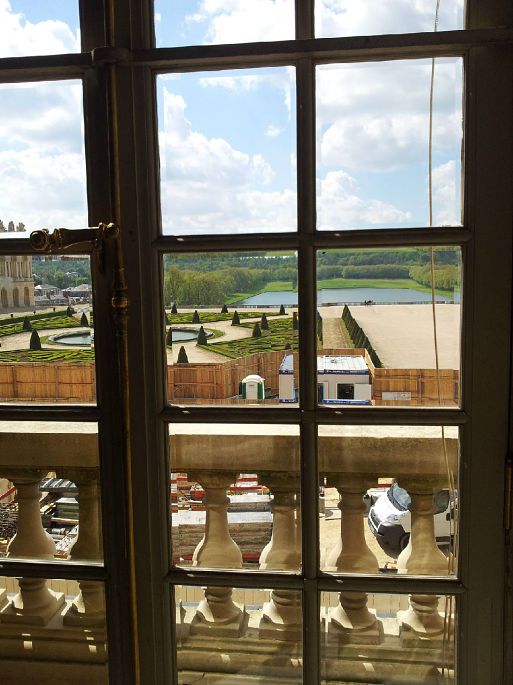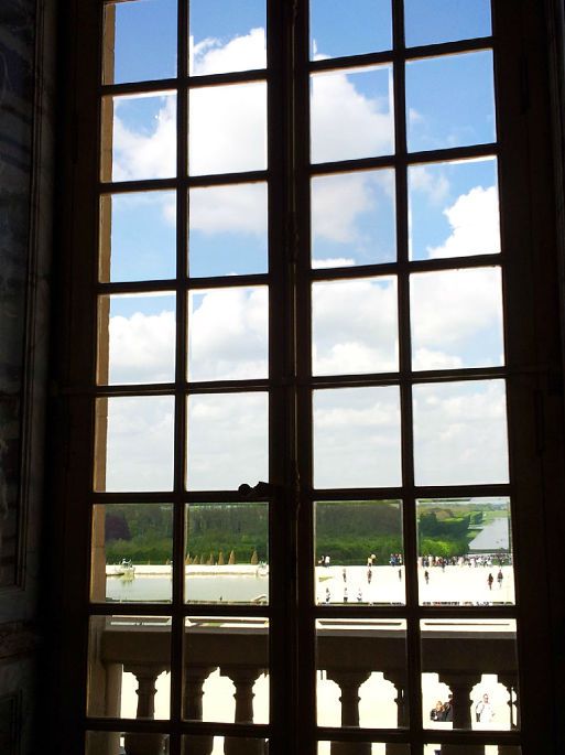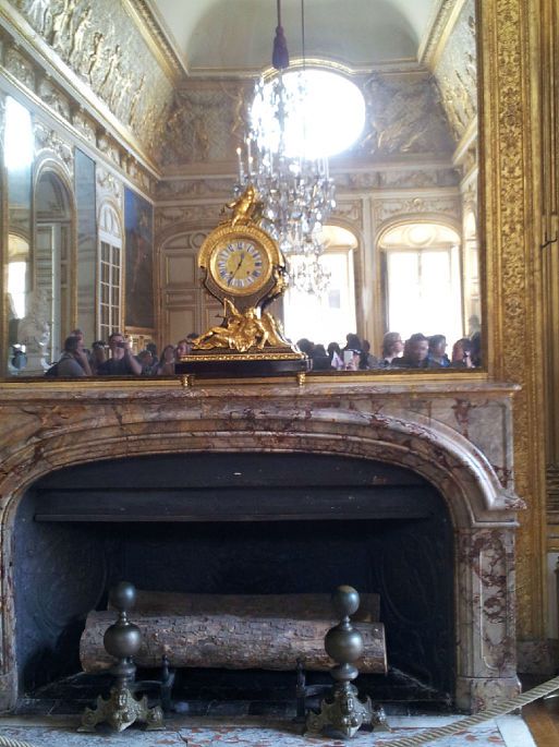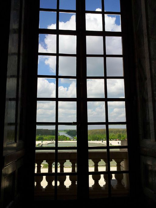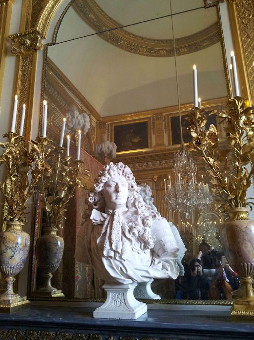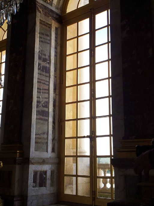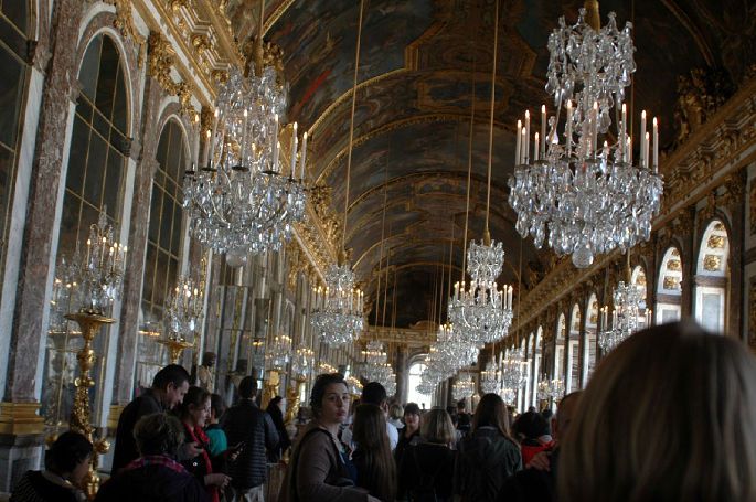 镜厅(Galeriedesglaces)是凡尔赛宫最著名的大厅,由敞廊改建而成。长76米,高13米,宽10.5米,一面是面向花园的17扇巨大落地玻璃窗,透过窗户可以看到花园夕阳。另一面是由400多块镜子组成的巨大镜面。厅内地板为细木雕花,墙壁以淡紫色和白色大理石贴面装饰,柱子为绿色大理石。柱头、柱脚和护壁均为黄铜镀金,装饰图案的主题是展开双翼的太阳,表示对路易十四的崇敬。这里经常举行盛大的化妆舞会。不过此时游人众多,想拍张照都只能是集体照了。