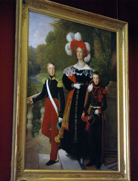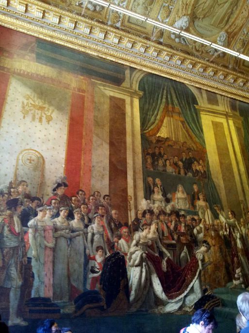 拿破伦授冕图,幅和卢浮宫收藏的一样。但是有一点不同,那就是画面左边第三个穿粉红色衣服的宫女,在卢浮宫中的那幅上,她穿着和别人一样的白色衣服哦。