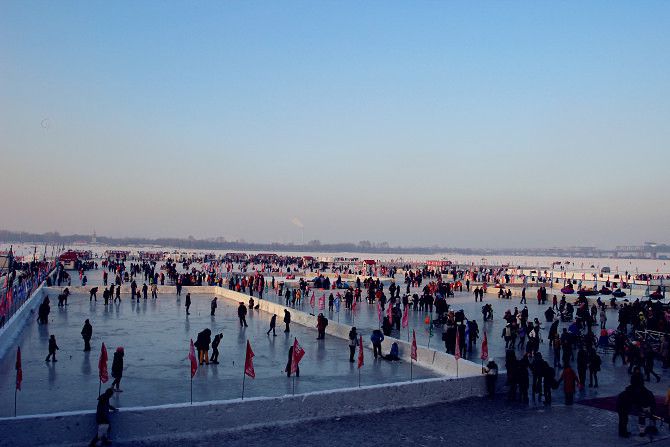 人多的话,可以结队玩冰上碰碰车,大滑梯,冰上排排坐(不知道具体叫什么,一排椅子连一起,整队人用杆子撑地前行),如果会滑冰,那边有租借冰鞋的服务。整个江面可以玩2~3个小时。光是在冰面上走走,也很有意思,一不留神就会摔跤。