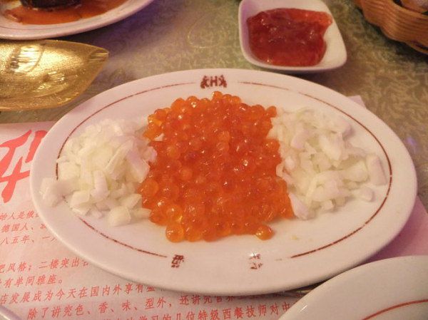 头菜:红黑鱼子210+酸黄瓜10(这个红鱼子是这里的最出名的菜,不过较贵)220元