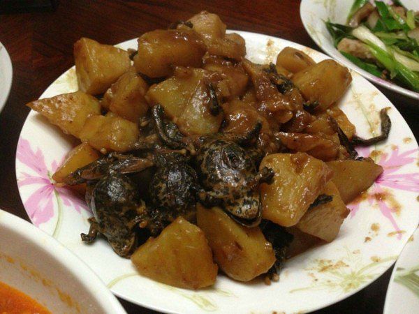 看了老板的菜单,雪乡用餐很贵啊,一盘花生米38,半只鸡炖蘑菇78,老板推荐,我们几个决定吃套餐,一个人30块一顿,老板看着搭配菜式,昨天吃过鱼子酱,我们决定今天在来个贵菜,蛤蟆炖土豆280一份,老板说这蛤蟆叫林蛙,就是上海人炖汤喝的雪蛤,活的哈尔滨一只就得卖80,蛤蟆比较少,估计有个7-8只,不过炖的很香,蛤蟆吃起来有点像大闸蟹公的膏