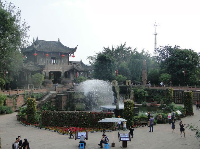 继续往前就是龙潭广场。这是一个下沉式广场,面积约2000平米,拥有龙生九子、黄龙吐水两大主题景观。设计源于诸葛武侯沉鼎配龙的历史传说。