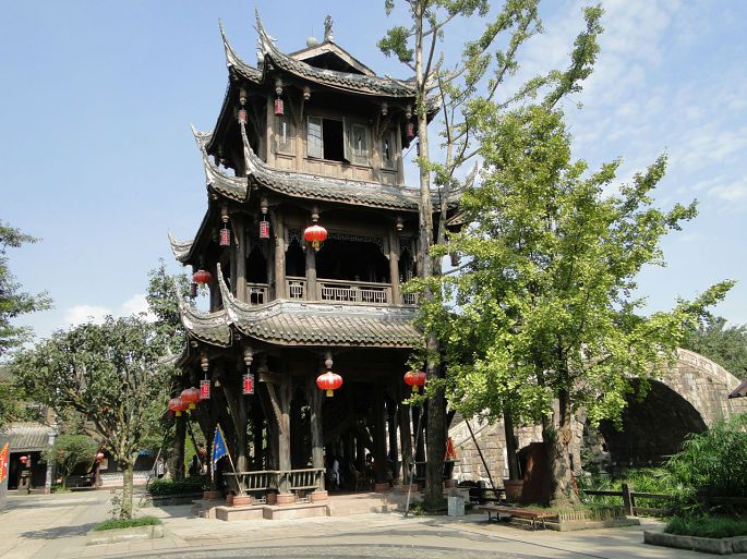 一进黄龙溪,离远处就能看到一座高大的蜀汉牌楼,门楼高14米,宽30米,跨街而立,气势天成,蔚为壮观。蜀汉门口全部挑选结实耐用的老木头,融入蜀汉风格的红砂岩,木石浑然一体,相映成趣,古意盎然,体现了黄龙溪厚重的三国文化历史渊源。据说这是新建成的。