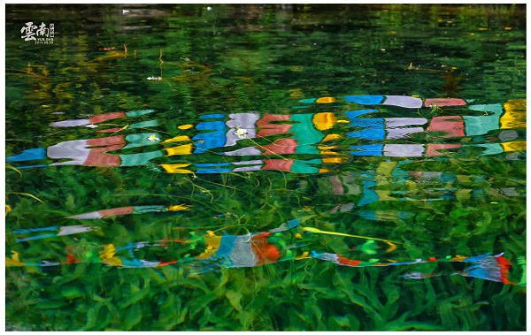 水清澈得能见到底部的水草,倒影着经幡非常漂亮的。
