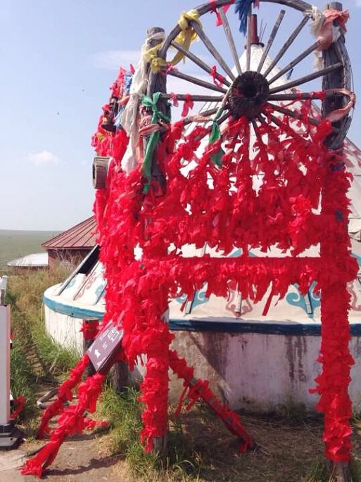 D2:伴着和煦的阳光和对旅程的期待,我们不约而同的7点钟准时起床,简单的吃过早餐后,我们去一家清真肉食店买了羊肉串和牛肉串,去菜市场买了些蔬菜以备烧烤用。我们的自驾旅途正式开始!第一次自驾还是有一些小紧张,但雀跃的心情很快就把这种情绪平复下来,十几分钟后,驶出海拉尔,上了201省道,辽阔的大草原逐渐展现在我们眼前,虽然只有少量的牛羊和被割过的草地,但第一次看到这种场景还是让我们激动不已,来到一处停车照相的地方,我们就撒鸭子跑啊,到处都是打好的草卷,围着一个草卷我们蹦上蹦下,蒿同学以他独特的姿势为我们四位女汉子拍了不少漂亮的照片,尽兴过后,按导航提示的速度大约行驶了一个小时,便来到了著名景区金账汗,这可是成吉思汗的家哦,这里满眼都是蒙古包,各个都很漂亮,账上的图案与整个蒙古包的形状衔接的很好,以每人20元的门票进去后,随人群来到了敖包(就是敖包相会的地方),这里有个风俗,拿着手里的红布条绕敖包顺时针转三圈,在祭台前双手合十许下愿望,最后系上红布条,愿望有可能实现(最早是用抛石头的方式,后来为了方便游客改称的系红布条)。