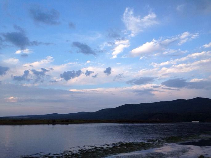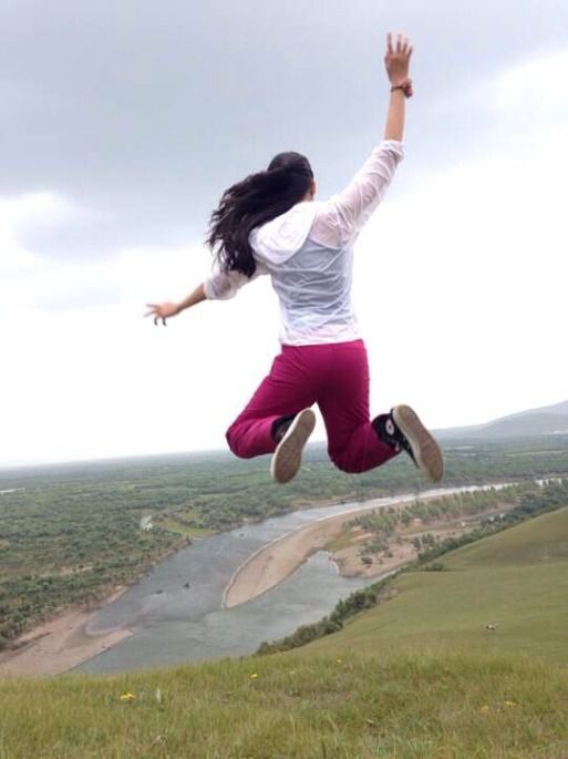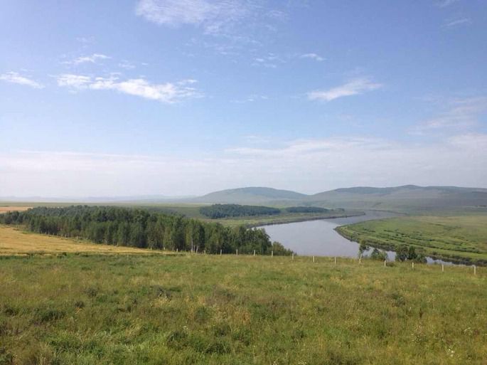 收拾停当,我们便徒步去了附近的湿地,据说这里和额尔古纳的湿地是一样的,而且不收费(额尔古纳的湿地门票80元),并且央视曾在这里高空拍过湿地俯瞰图,我们果断的去了。走了没几分钟便来到了湿地旁,哇,另一番景象啊!除了在内蒙古常见的蓝天白云外,这里的水好像比别处更清澈,远处小山上满山的绿草把水映衬得更加通透。湿地的一大特点很明显,水边全是石头,再远点便是松软的湿地,放眼望去,树木是成组存在的,两三棵一组,或一棵大树一组,整体比较稀疏,但树的形状很饱满。我们顺手从河边捡起一块扁形石头,开始了打水漂,最后我和朱朱打成了平手,都是初次尝试,我俩一人能打四五个。湿地的边上也有很多漂亮石头,我们每人都捡了些,有大的、小的,红的、绿的、蓝的,形态各样的,在这里最有意思的当属山顶大跳、吹大风,吹蒲公英,站在山顶俯瞰额尔古纳额尔古纳河黑山头湿地,真像一幅美丽的画,弯弯曲曲的额尔古纳河绵延几千里与大片大片的陆地,植被相互缠绕,突然让我感觉地球母亲太伟大了!在此地逗留了2个来小时后,我们迎着大风和零星的雨点,伴着浓浓的牛粪味回到了车里。Ps:这里的牛粪晒干后还可以做柴火的。
