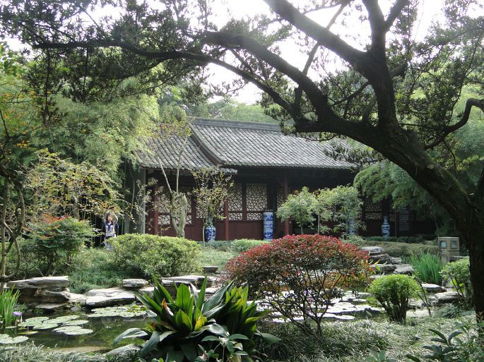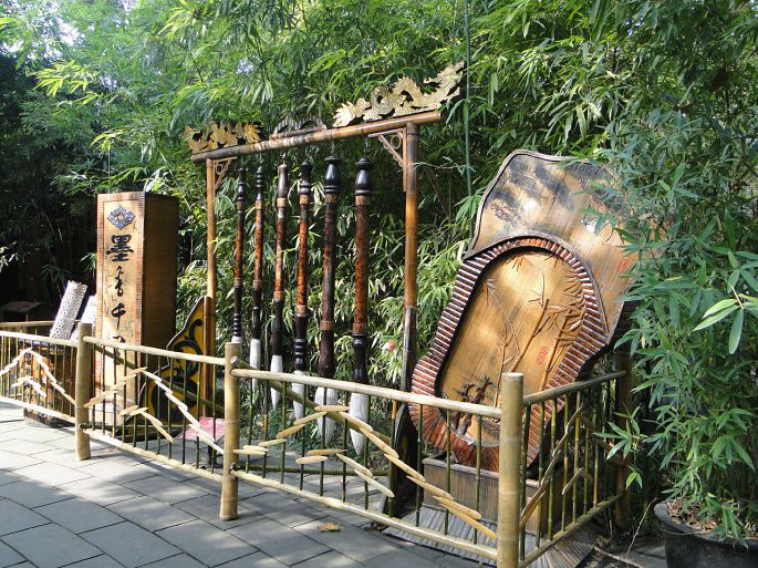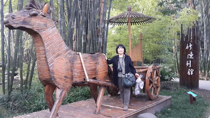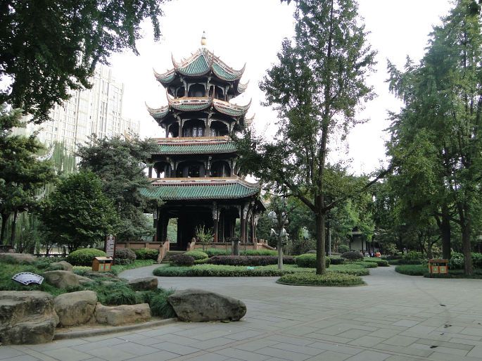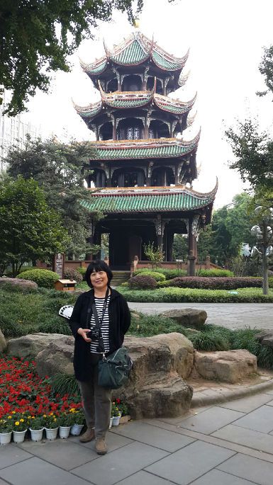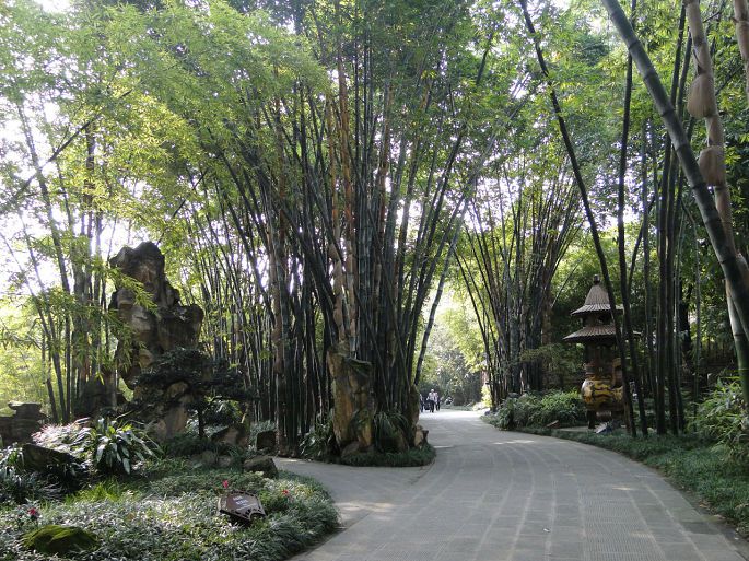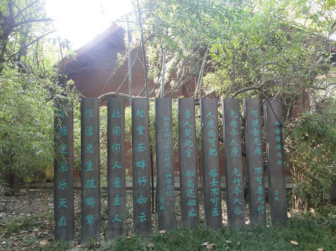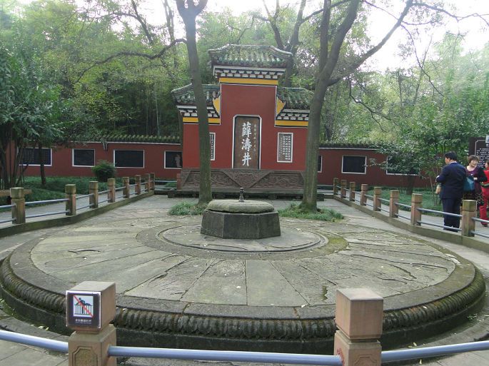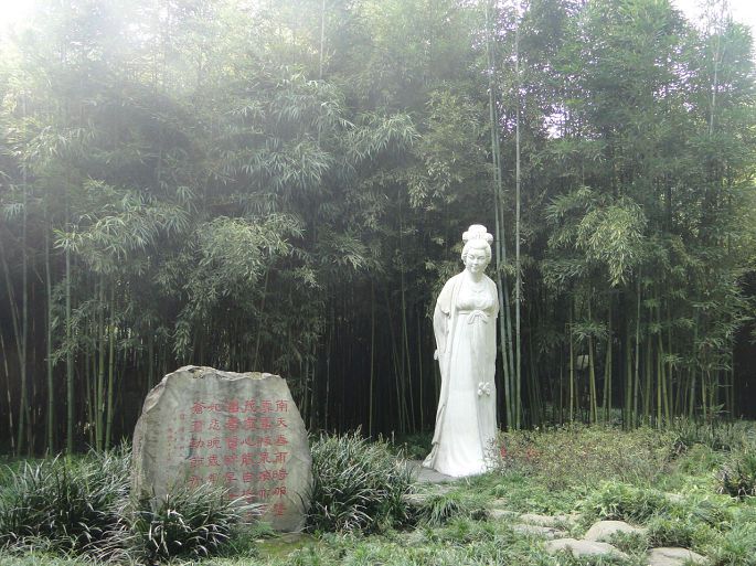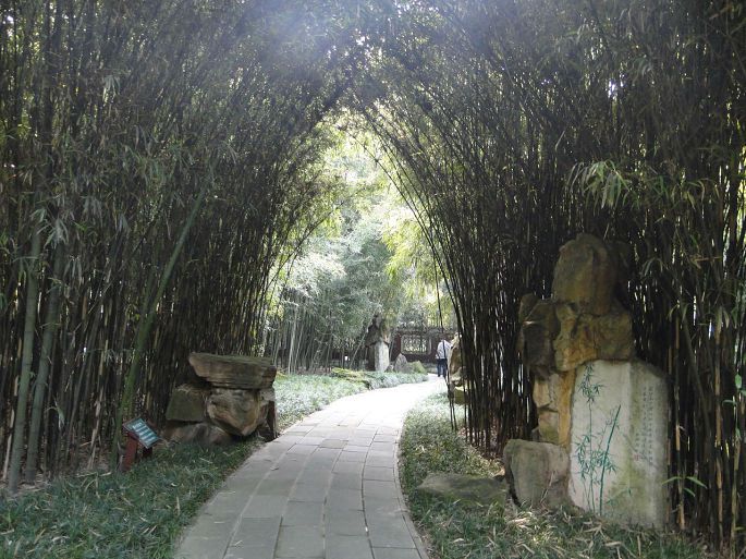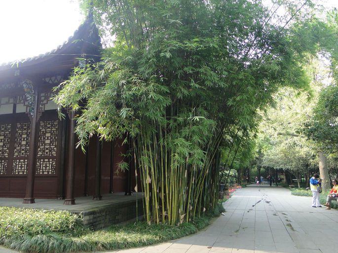我们沿着府南河,一直走到了望江楼公园。这里是为纪念唐代女诗人薛涛而建的。薛涛生前并不住在今天的望江公园,只是去世后葬于成都东门外的锦江河畔,望江公园内有她的土冢。到明代时,蜀献王朱椿为了纪念薛涛,就在今天的望江公园打井建作坊,仿制薛涛笺。到了清康熙年间,在井旁刻了一通“薛涛井”的石碑,从此,人们就以为薛涛故里在今天的望江公园了。据说薛涛曾在此汲取井水,手制诗签,留下了许多幽怨动人的诗句。因此明清两代先后在这里建起了崇丽阁、濯锦楼、浣笺亭、五云仙馆、流杯池和泉香榭等建筑。也因薛涛一生爱竹,后人便在园中遍植各类佳竹。园内崇丽阁俗称“望江楼”,是成都的标志建筑之一。 在竹林中行走,会觉得我们仿佛远离了纷扰,走进了一个清幽的世界,感到心里一片安宁。