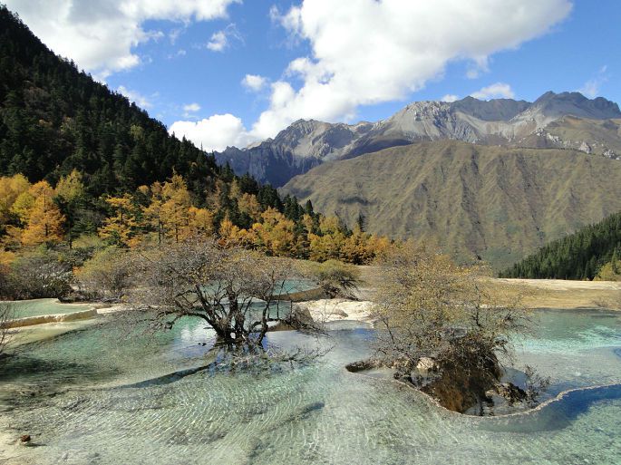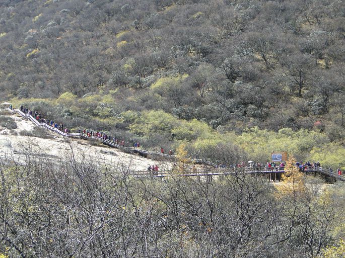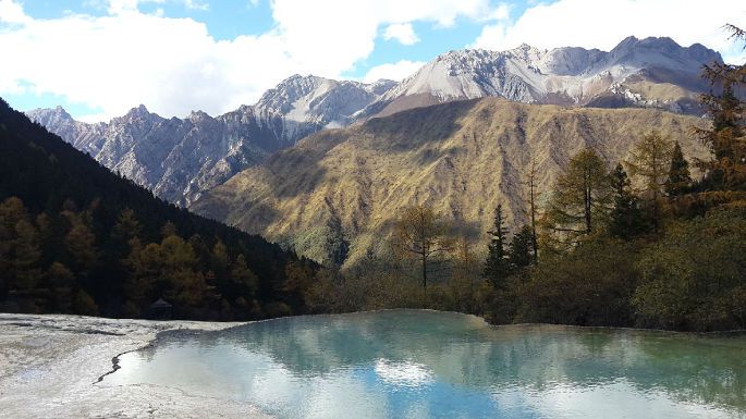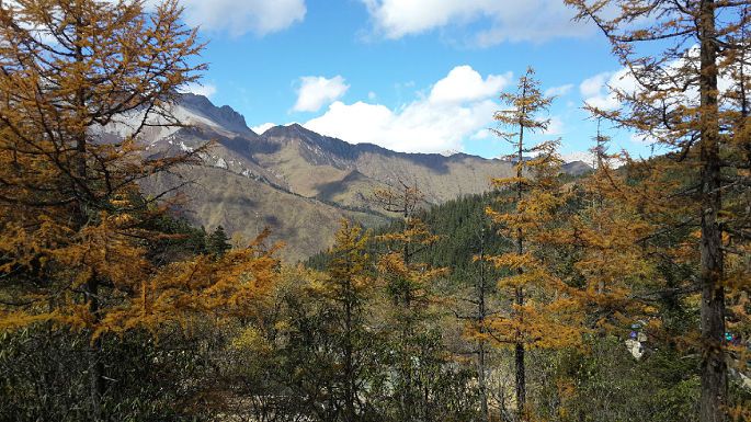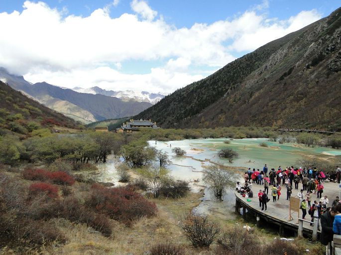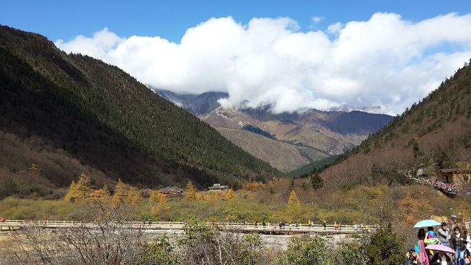 黄龙风景区,在四川省阿坝藏族羌族自治州松潘县境内,与九寨沟毗邻,大约相距100多公里。黄龙沟位于岷山主峰雪宝峰,下临涪江源流——涪源桥,是一条长7.5公里、宽1.5公里的缓坡沟谷。沟内布满乳黄色岩石,远望好似婉蜒于密林幽谷中的黄龙,黄龙沟名即来源于此。明代时在此修建了黄龙寺,用以奉祀黄龙。我们10月18日包了一台商务车,六个人一早就从九寨奔向黄龙景区。路过川主寺,我们把晚间住宿也安排好才进入景区。?xml:namespace>