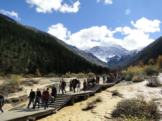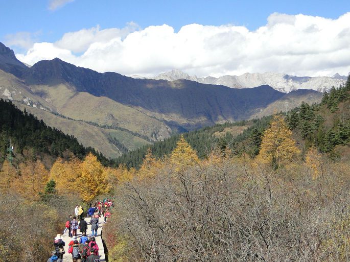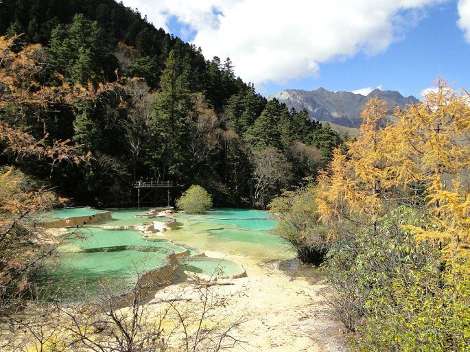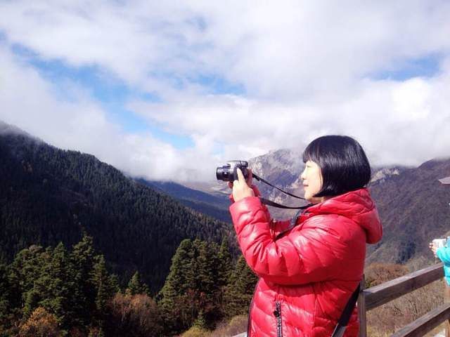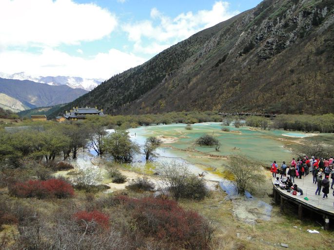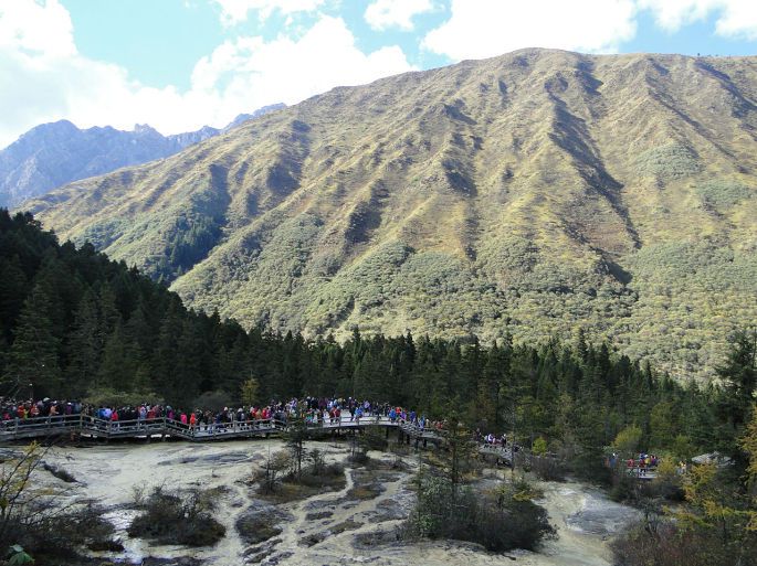 岷山主峰雪宝鼎海拔5588米,从顶峰流下的雪水汇聚成溪,沿石钟乳山坡倾泻而下,跌宕起伏,形成众多的瀑布悬流,这些瀑布泻落至山腰处,便散落聚积,从而在黄龙沟内形成了3000余个碧透斑斓的彩池,大者千余平方米,小者仅几平方米,千姿万态。池水清净,深浅不一,有的地方色彩鲜艳,仿佛彩锦,被称为“五彩池”或“人间瑶池”。 黄龙景区以彩池、雪山、峡谷、森林“四绝”著称于世,也曾有人说应该加上滩流、古寺、民俗称为“七绝”。正因如此,现在的黄龙风景区也是比较有名气的。黄龙沟景区具有世界罕见的钙华景观,规模宏大、类型繁多、结构奇巧、色彩丰艳的地表钙华景观构成了她的主景。我们是坐索道上去,沿着木栈道向五彩池前行,路很好走,大多是平路或下坡路。一群人沐浴着阳光,呼吸着大自然的清新空气都很兴奋。到了第一个观景台,大家就被美景震撼,不停地按下快门拍照。