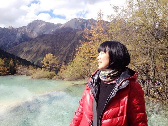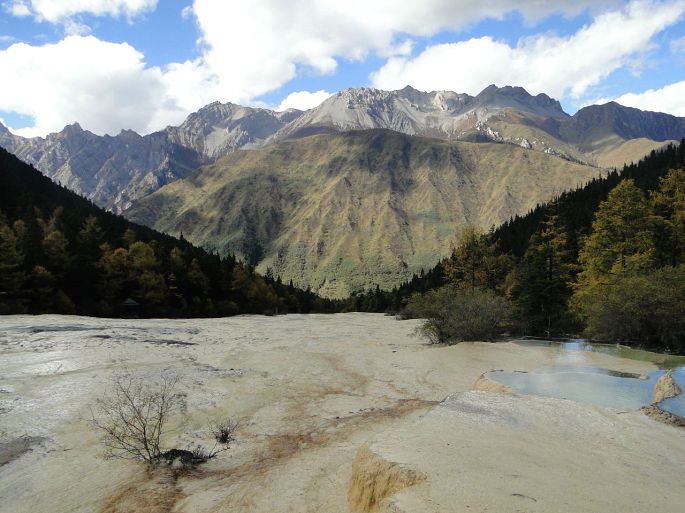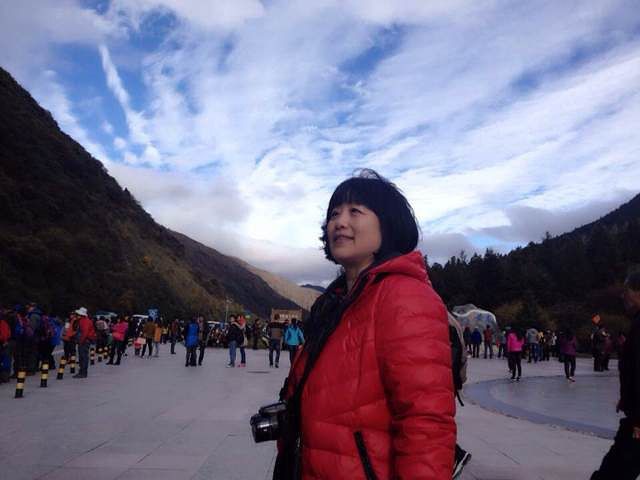 我们的车一直在盘山路上行走,感觉前面一片雾茫茫,由其路过雪宝鼎时,更是前面一片白,什么也看不到。然而我们到了景区后,天气却是出奇的好,天空湛蓝并飘着朵朵白云。在这样的好天气下游黄龙,真的就仿佛是在画中游。