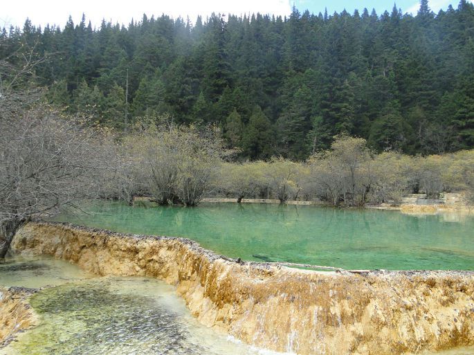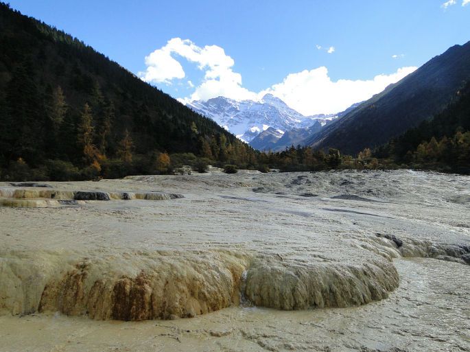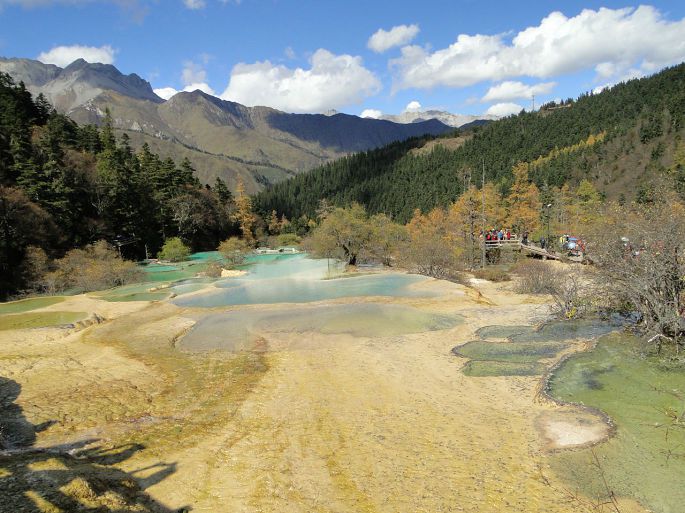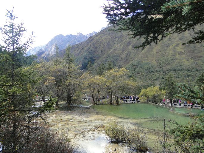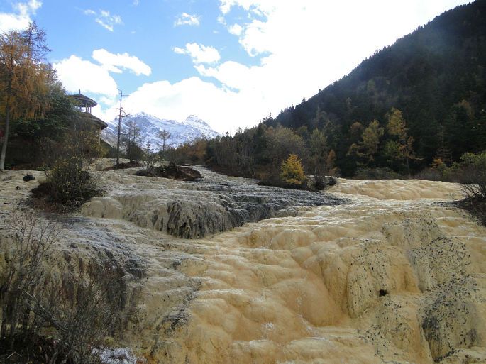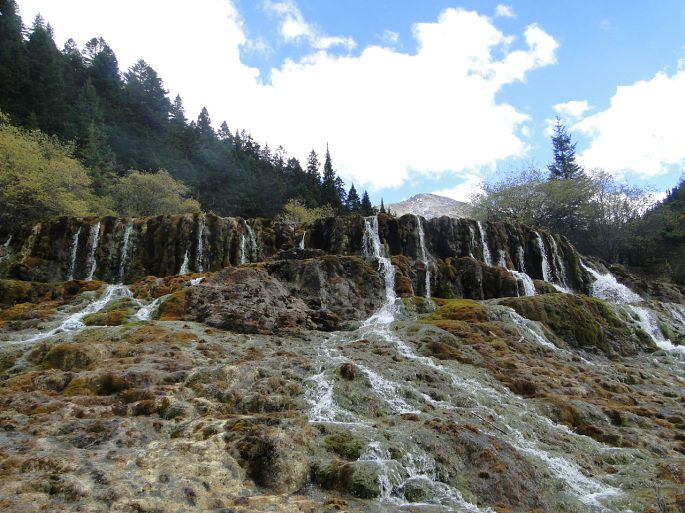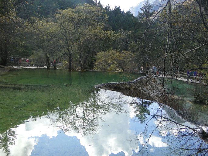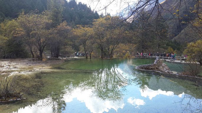 由于常年的钙化作用,黄龙是一座名副其实的天然钙华博物馆。沟3600米区段内,同时组接着几乎所有钙化类型,钙华湖、钙华滩、钙华扇、钙华瀑布、钙华洞穴、钙华台等钙华类景观一应俱全。彩池数多达3400余个;边石坝最高达7.2;扎尕钙华瀑布高达93.2米。这些都属中国之最,世界无双。从五彩池下行到沟口大约三千多米。我们走了大约3个半小时,一路上途经争艳彩池→娑萝映彩池→明镜倒映池→盆景池→金沙铺地→洗身洞→金瀑泻银→潋滟湖→飞瀑流辉→迎宾池,最后回到黄龙景区大门口。路途虽然经较长,但是一群人边走边玩,说说笑笑也没觉得太累,也可能是因为景色迷人,当你走完这段路时你还会感到意犹未尽,一路上都有美景相陪,走起路来你就会有激动和动力。