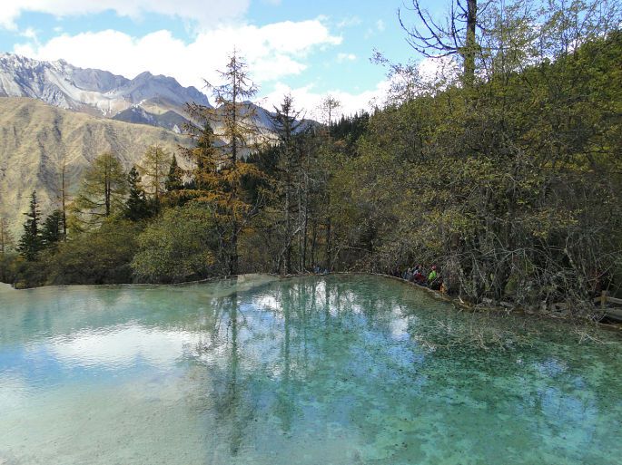 大约走了有1个半小时到了五彩池。五彩池是黄龙沟内最高点的一个彩池群,海拔有3900米。池群由于池堤低矮,汪汪池水漫溢,远看去块块彩池宛如片片碧色玉盘,蔚然奇观。“玉盘”在阳光的照射下或红或紫,浓淡各异,色彩缤纷,极尽美丽娇艳。从这里可以远眺5588米高的岷山主峰雪宝鼎,漫步池边,无数块大小不等,形状各异的彩池宛如盛满了各色五彩颜料的水彩板,兰绿、海兰、浅兰等等,艳丽奇绝。还好我们都没有高原反应,因此一路上很兴奋。据说在隆冬季节,整个黄龙玉树琼花,一片冰瀑雪海,唯有这群海拔最高的彩池依然碧蓝如玉,仿佛仙人散落在群山之中的翡翠,诡谲奇幻,被誉为“人间瑶池”。