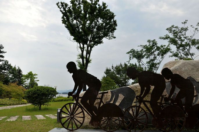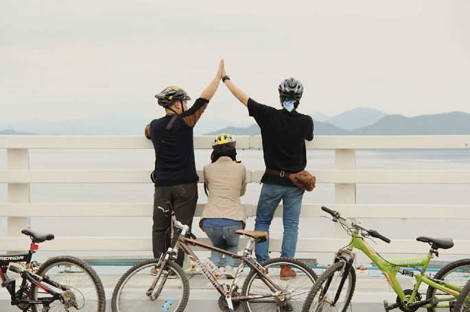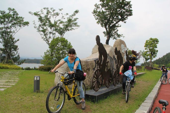 :再往前骑一点吧,看那边远处的桥(指着不远处的桥),看上去也不是很远了嘛!