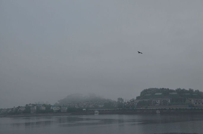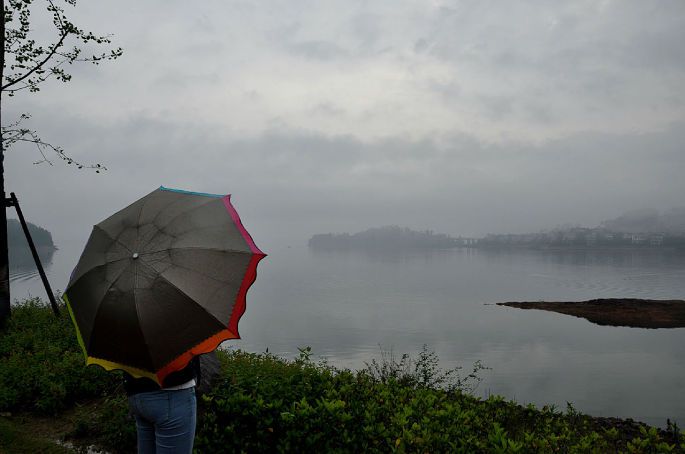 :被大雨吵醒了,但是随着时间流去,雨水慢慢的变小了,千岛湖隐没在朦胧的雾气中。