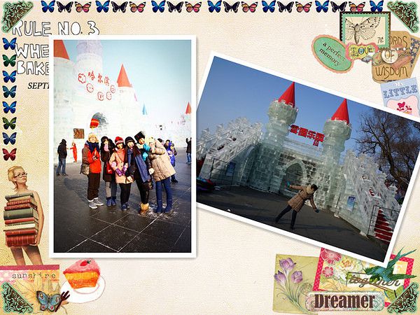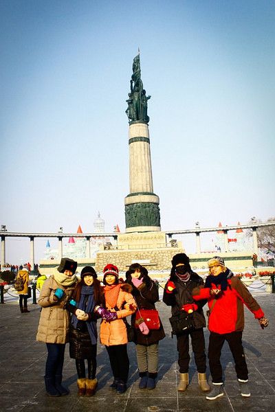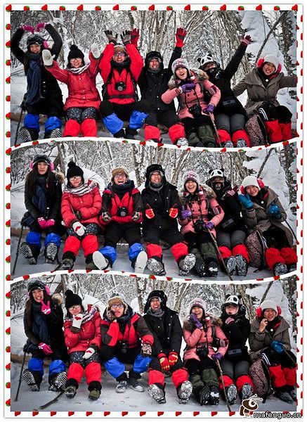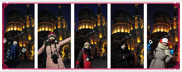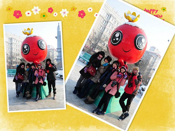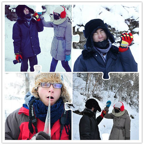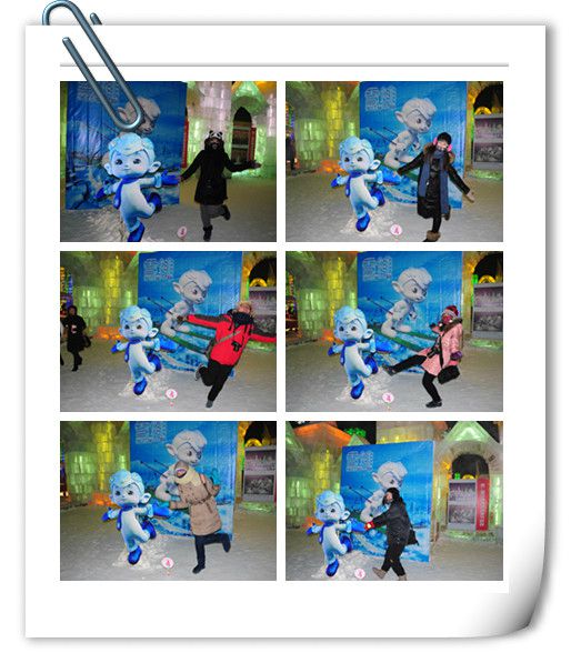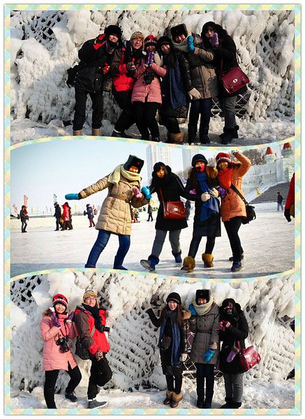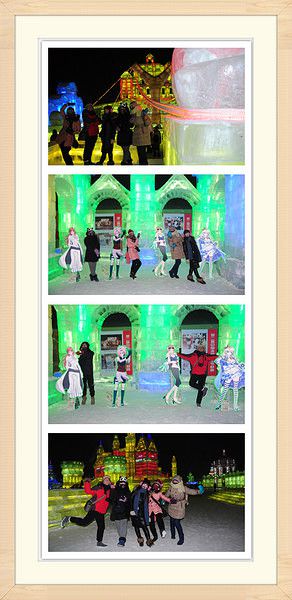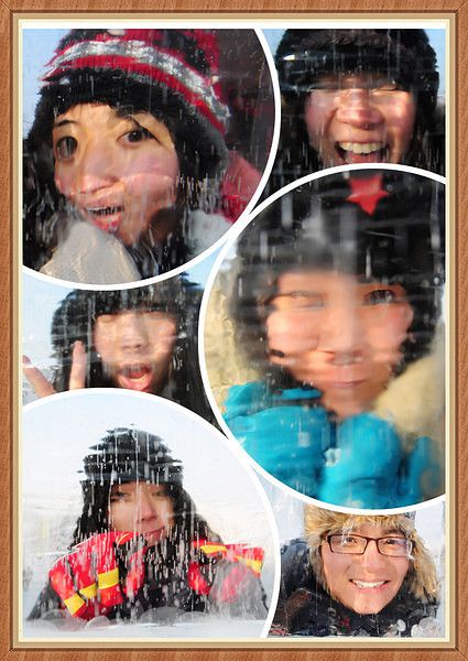 入口是用冰装饰的,找到了一块透明得不行的冰,于是乎 我们的集体头像就诞生了。