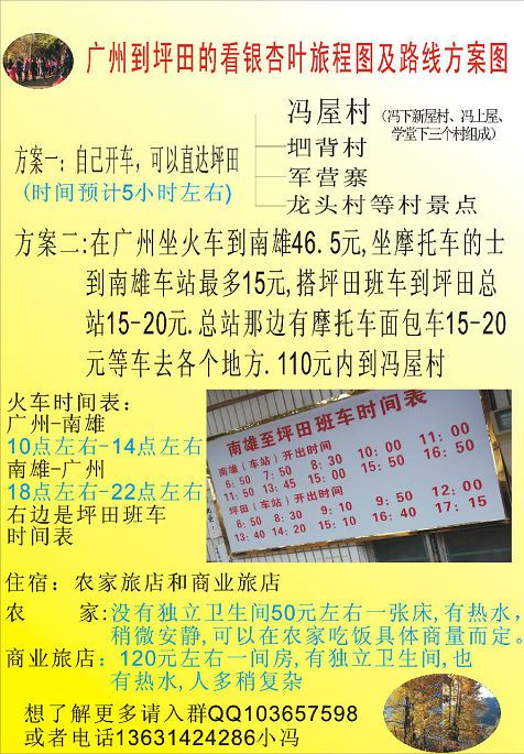 马上迎来2014一年一度银杏之深秋,很是期待十一月旅游季节的来临~那种自然旅游之美景一幕幕地映入眼帘。欢迎来自五湖四海的朋友来我们的故乡旅游观光,除衣食住行,所有都是无门票景点,可以吃到粤北的特色香菜,也可以采购各式各样的年料哦,比如风干腊肠腊肉、板鸭、野味和土鸡蛋等,有意向的可以找我13631424286QQ群103657598————岭南魅力名镇广东省南雄市坪田银杏之一乡——冯屋村