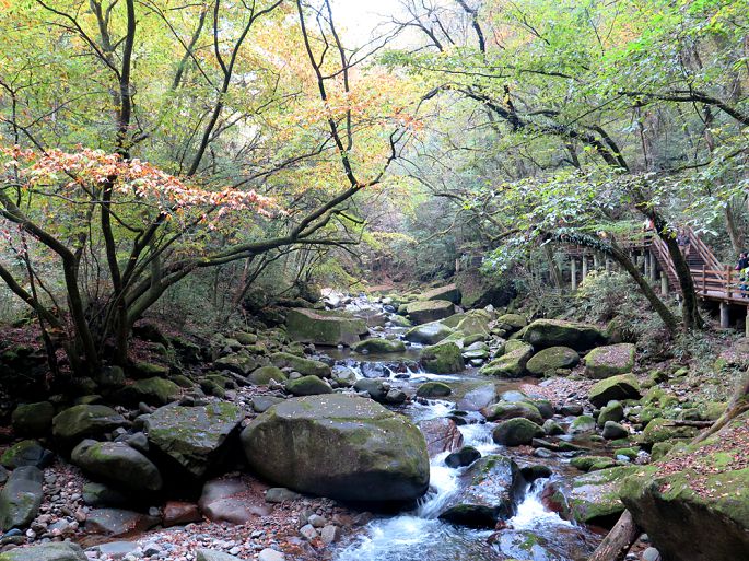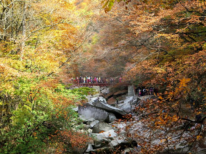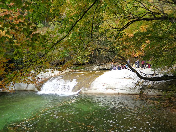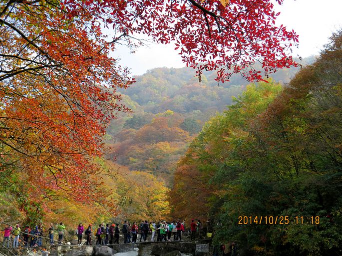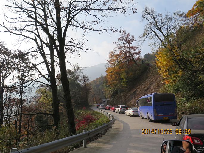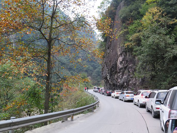 第二天,怕景区堵车,提前给酒店附近一小食店打招呼,早晨5点半就去小店就餐。从汉中到光雾山景区有75公里山路,全程水泥路,弯道较多,8点来到景区门口,长长的旅行车队已排成长龙,随队缓缓行进,进入景区后,起伏的山蛮中开始呈现五彩斑斓的美丽景致,远处伟岸的奇异山峰被金黄和火红的植被包裹,显得铁骨柔情,光艳迷人。车队在宛延的群山中走走停停,如此美景,让游人放慢了腿步,"停车坐爱枫林晚,霜叶红于二月花。"古人情至,今人同怀。光雾山景区分桃园、大坝和十八月潭三大部分,我们这次只游览大坝景区(米仓山景区),也是金秋红叶的经典景区。来到大坝,被要求换乘景区观光车,数千的游人同时涌堵在一起候车,1小时的等待.乘车到达黑熊沟,被全部赶下车沿景区观光道前行。密密麻麻的游人分布在沟壑中,人在景中,景在人中,在**中碎步穿行1小时走完了这段,一阵拥挤,又上了到香炉山的观光车,据说登顶可饱览众山,赏层林尽染,沿途山色很美,可惜车速太快,一路不停,车行1小平坝处,游客再次被赶下,要求再换乘中巴观光车,看着那如麻的的候车**,我终于没有了继续前行的勇气,只好抱憾返程。午后近2点,我们才在景区找到1农家乐就餐,只见饭菜一上桌,万筷齐发,大有风卷残云,摧枯拉朽之势。饭后,游了一下大小兰沟就匆匆踏上返程之路,可悲的是,回程道路更堵,从下午3点,伴随山野的夜幕和丛林黑熊的嘶吼声蜗牛般爬行了7个小时才回到汉中城内。但相比众多举家自驾游山却堵在路上几个小时,还未进入景区就被迫返回的游人又算是幸运的了。