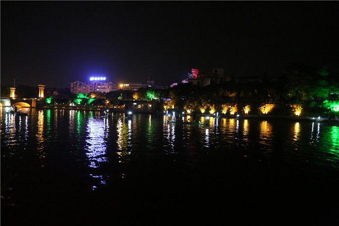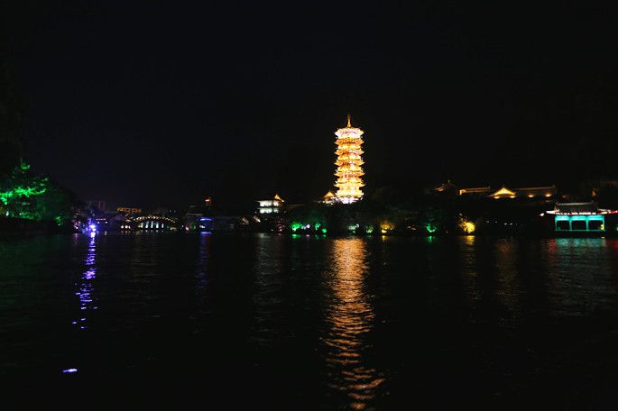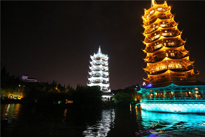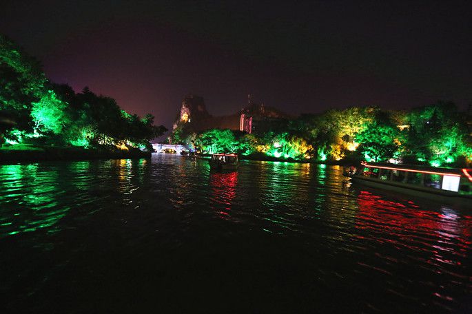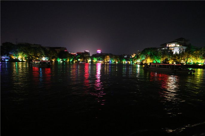 两江四湖是指由漓江、桃花江、榕湖、杉湖、桂湖和木龙湖所构成的桂林环城水系,是桂林城市中心最优美的环城风景带。“千山环野立、一水抱城流”主要就是指的此处。两江四湖静静的环绕着桂林市区,山以水为血脉,故山得水而活;水以山为颜面,故水得山而媚。夜晚的两江四湖景区在五彩缤纷的灯光照射之下,城在景中,景在城里,让人分不清楚到底是城、还是景。