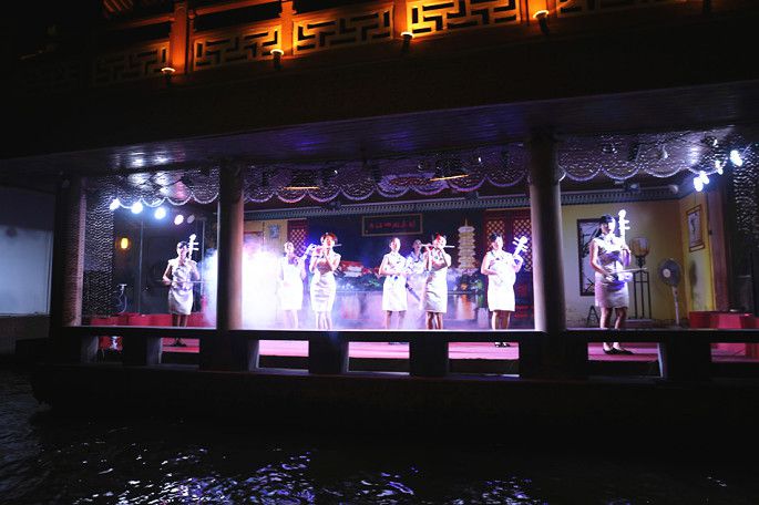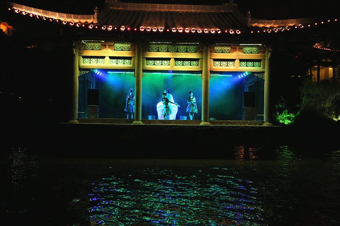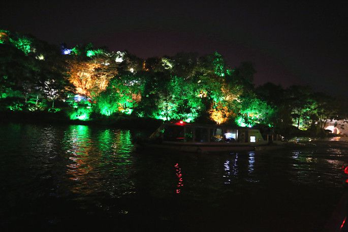 湖光山色加之雕栏画栋,在现代高科技灯光效果的映衬下,显得七彩斑斓、绚丽夺目。船行湖中,人在舟上。绿树丛中、亭台水榭间,湖边的铜鼓笙歌、瑶池沐浴等表演背后,是桂林千百年的历史沉淀。古朴、传统的音乐伴随着各具特色的民族歌舞表演,仿佛人间仙境。