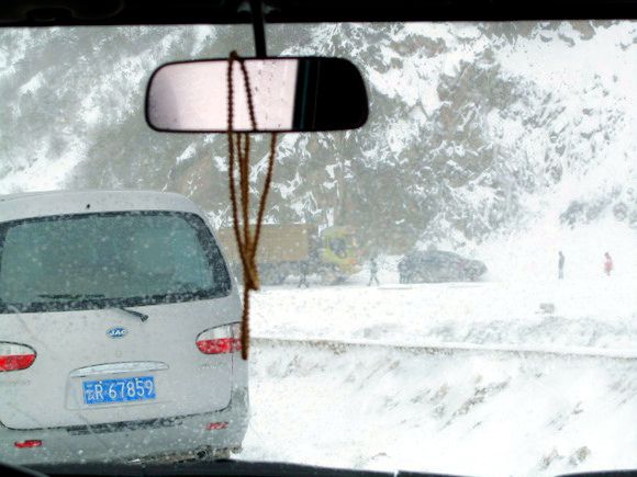 小面包车的飞奔却也没飞过漫天飞雪的速度,果然我们给堵在了垭口的某一段U型弯道上将近3小时。大雪封山,大车会车堵道。默灰为了缓解无聊的气氛:竟然在车里大胆表白。于是至今,我都记得这样的“理论”——大雪封山堵车的车内最好表白了,反正对方逃也逃不掉。囧~~,另外一个让我无限惊奇的是:慧子和小柱子,竟然带来了各种各样的糖果。巧克力,Rio,日式软糖,还有跳跳糖!!!太开心。