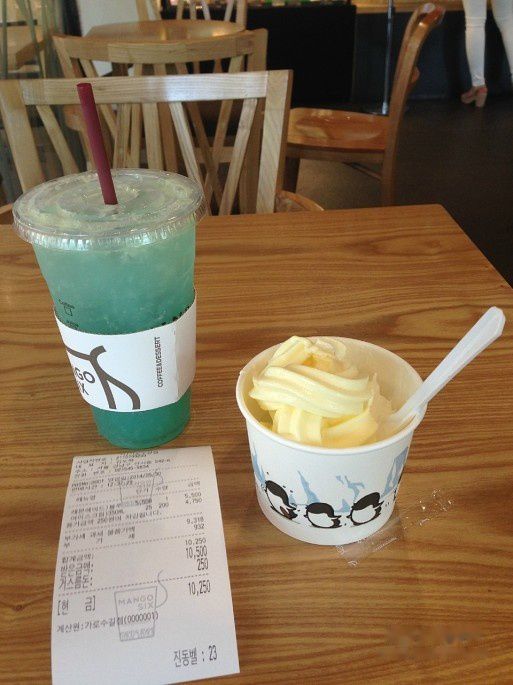 阳光很晒,天气很热,在路过的“mango six”家喝了蓝色的冰柠檬水(5500韩元)和自己接的芒果酸奶冰淇淋(4750韩元)。这两样都特别好吃好喝,强烈推荐。