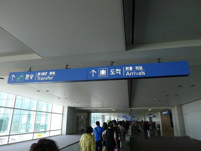 9时的飞机,1个半小时到达,但韩国时间要比北京时间早1小时,是11:35到达。飞机好快,提前20分钟就到达了仁川机场,于是11:20就到达机场出口。但人多,好几个航班同时到达,出关有点慢,办理入境手续后得坐地铁到另一个航站楼取行李(不必担心,有中文提示,跟着**走就一切ok).