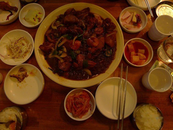 安东鸡很好吃,我们不要放辣椒也很好吃,很入味的感觉,粉条吃的时候用剪刀剪断,配着米饭和赠送的小菜,很美味,吃得很饱的感觉。妹子家的孩子吃得很香,以后的几天,一问吃什么,她就会很自然地说,吃炖鸡。
