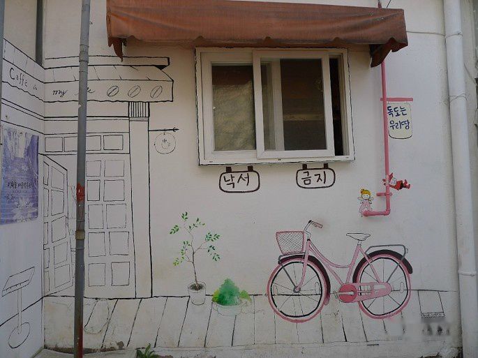 壁画村不大,壁画也不太多,但坡路上的鱼和梨花的画很有名。
