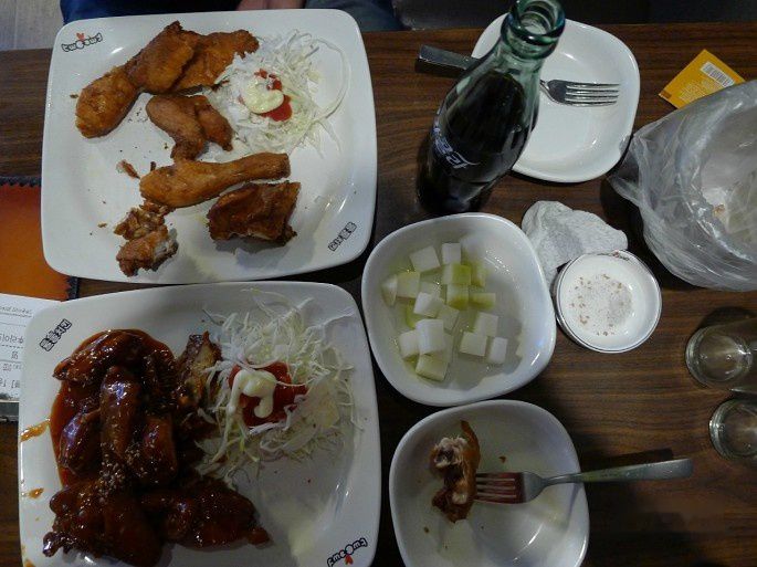 原路下山,在我们来时路过的太平洋酒店旁的“twotwo”炸鸡店吃炸鸡,点了半份原味,半份拌鸡,17000韩元。炸鸡真好吃,原味的最好吃,但拌的有点辣。点了当地的可乐,1600韩元,说实话,没什么不一样。就是那个味,味……