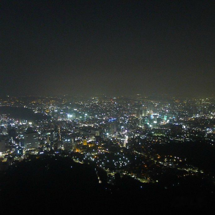 又等了半小时,我们终于上到塔顶,这时天已经全黑透了,楼下的首尔市容,很是灯光璀灿,很壮观,可我的相机不给力,照夜景马马虎虎。