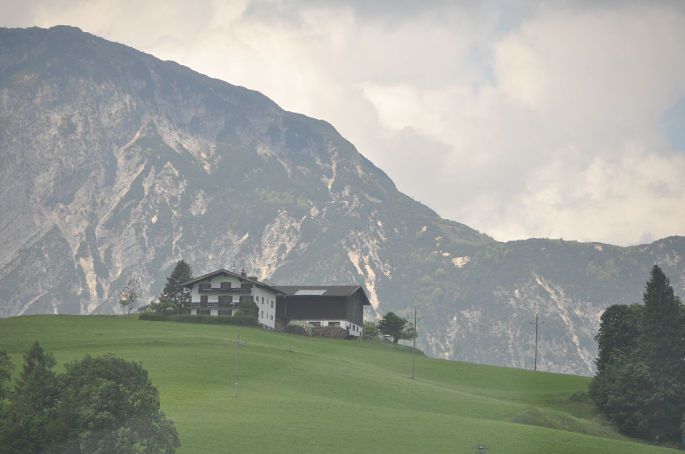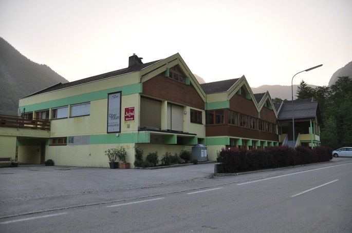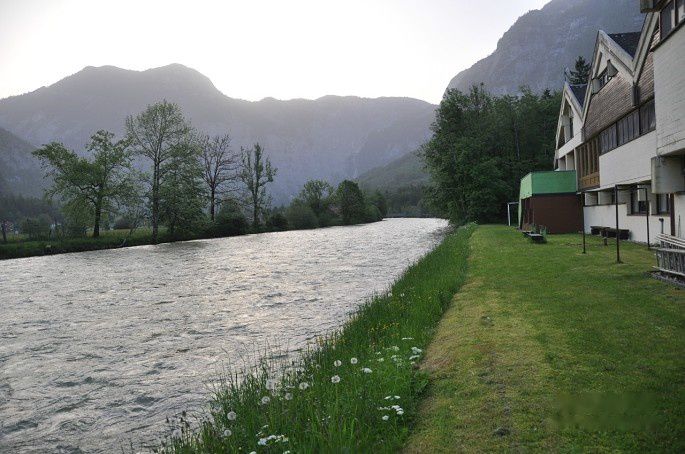 已经是下午四点多了,问姑娘附近有没有其他住宿,她马上查了一下,说离这不远,有个小镇叫Obertrun,那里有。联系上了酒店,两晚73欧元,包两顿早餐,一顿晚餐。坐上最近的一班车赶往Obertraun。酒店距镇中心还有一段路(走路15分钟)。到了一看,很不错,自己一个人一间大房,是三人床的,有浴室。就是要share洗手间。Hotel座落在小河旁。