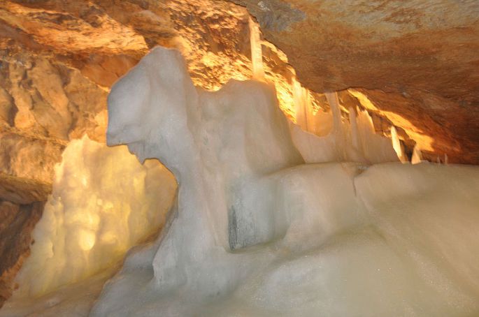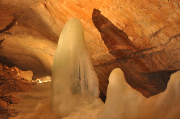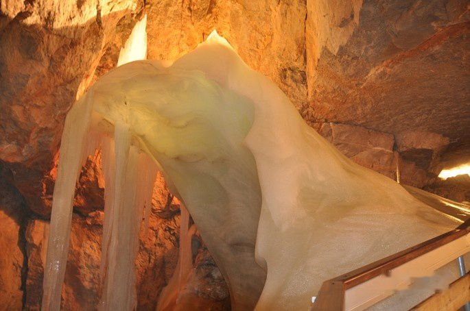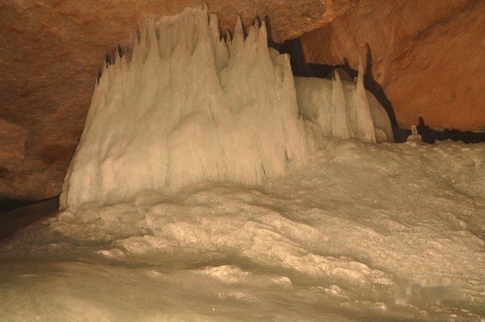 已经有不少人在等候,也不知道是干什么,就一起傻等吧。五月的奥地利,已经是春暖花开。温度已经有20多摄氏度,我只穿了一件短袖球衣和短裤,外带了一件防雨的薄衣。等了一会儿,门开了,一群人等,一起进了山洞。黑麻麻的什么都看不见,门口还有人问是那国的。还没等我反应过来,一张中文的硬朔纸片,已经塞到我手里。是一张景点和注意事项的说明书。纸上说明不能落队,因为每段景点是过了就关灯。啊!那么恐怖?这到底是什么洞啊。随着**往前走,冰!是冰,洞里渗出阵阵寒气。穿上薄风衣也等于没穿。我都快成冰棍啦。随着灯光亮起,一片片千年寒冰,排立在面前。我还从来没有见过在洞里的藏冰,跟钟乳石一样多姿多彩,绚丽无比。感叹老天神笔。
