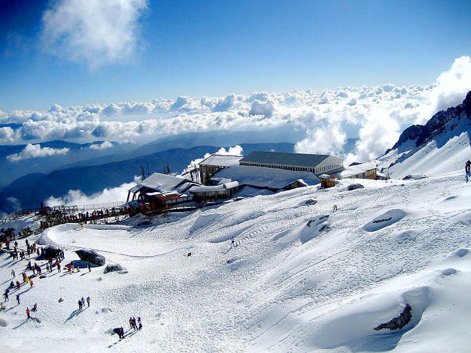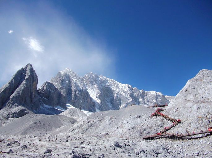 第二天,我前往了丽江的神山——玉龙雪山。在途中,我租了羽绒服和氧气罐,全副武装,直接坐了大索道(去玉龙雪山有三种索道可以坐,分别为小索道、中索道和大索道,而只有大索道可以到达玉龙雪山的山顶)上到海拔4560米的地方然后开始徒步登山,天公不作美,一直淅淅沥沥的下着小雨,走在山路上,就像走在云层中,朦朦胧胧,看不清周围的景物,很多游客开始集体唱起了东方红,希望太阳可以快快出现。