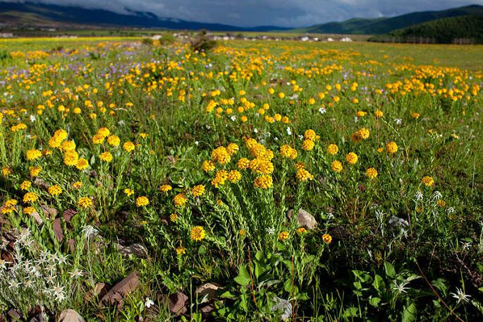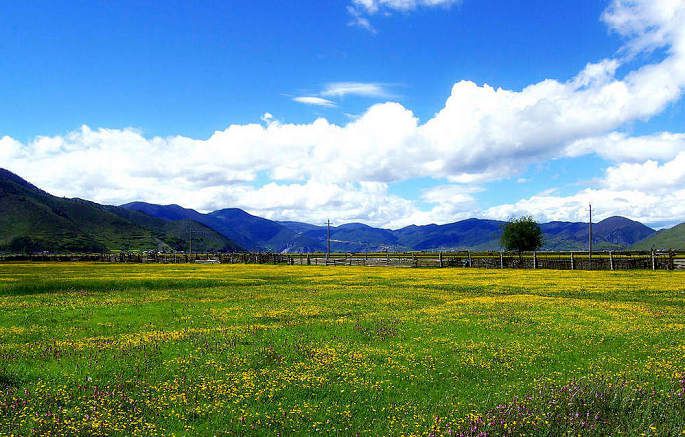 从虎跳峡又驱车两个小时左右,便到了让人魂牵梦萦的香格里拉,连绵不断的高山,满是牛羊的草甸,零星的藏民木屋,(每间藏屋前面都有几根大柱子,柱子越粗,代表这户人家越有钱,一般的藏屋顶上都插有一根旗帜,而有的藏屋顶上则有三根旗帜,代表这家有人出家做了喇嘛,在藏区,家里有人做喇嘛是件相当光荣的事情。为什么觉得光荣,不得而知,应该跟宗教信仰有关吧,听说做喇嘛到最后是蛮有钱的。)在草原默灰给我们拍了很多漂亮的照片,感觉自己飞翔在空中!