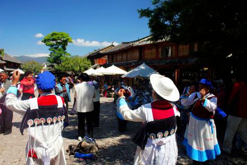 走进古城的巷子,很快被一路上花花绿绿的有纳西特色的围巾、披肩、头饰、服装等所吸引,看得忘乎所以。发现古城的房子并不华丽,不像江南的古城,艳于雕琢,而是很朴素,很随意,甚至趋于简陋。像纳西人的心一样,只是用心去品味生活,而非刻意渲染。就是这样的平静,却让我无端的感动。四月的丽江,寒意已远去,可喜爱阳光的游人们,三五个聚一起,在阳光的沐浴下,语气平和的谈着什么。阳光,在丽江的古城里,变得不寻常,如此的平易近人。