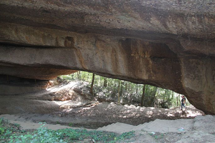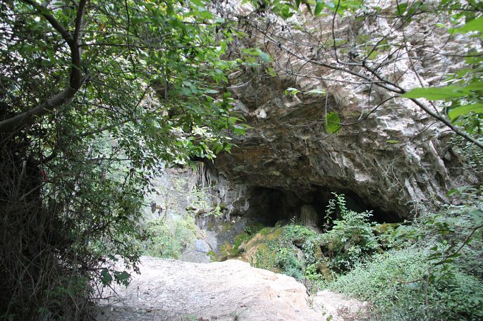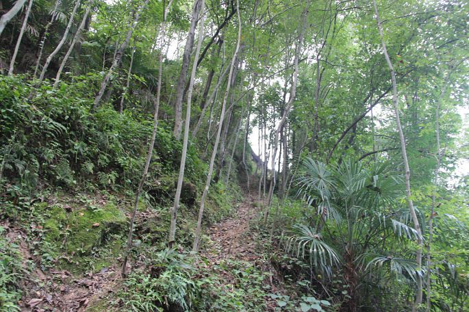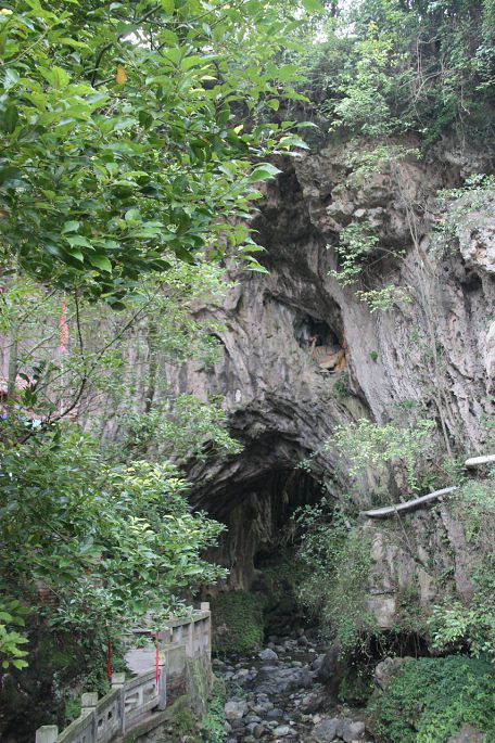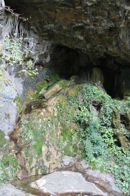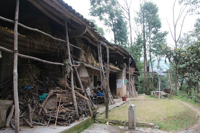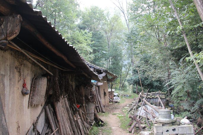 古汉源在一面绝壁下的一个洞口处。从村部沿路下来约几百米,路边有个新建的农房。不到新房处有条小路,上去后是一户农家,很老旧的房子。绕过这家农户,有条小路顺着山腰横切过去。转过一个山脊,就可看见前方山峰的那面绝壁,绝壁下有个小房子。朝着这个方向走,约半个小时,就到了古汉源。