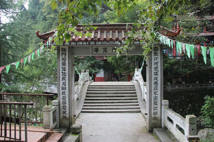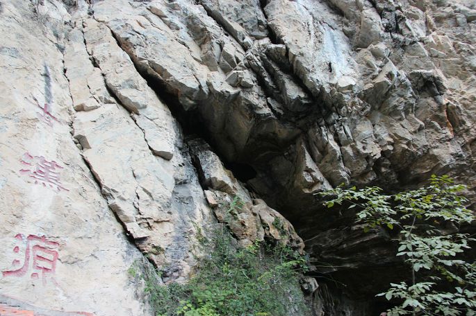 古汉源洞口不大,也不深,岩石上方有水渗出。先前看到的小房子为今人建的简陋小庙,面对洞口左边的岩壁上写着古汉源三个字。