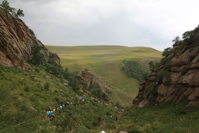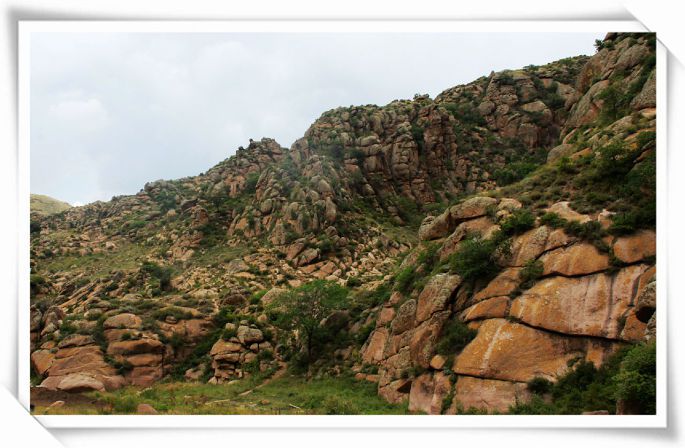 黄花沟是辉腾草原上一处有名的景区。停车场已经歪七竖八地塞满了汽车,景区的管理给人凌乱的感觉。门票45元,还有索道票,建议不要购买,单程也不要。草原就是草原,草原上设个景区,会有什么不同呢?黄花沟看出我的疑惑,只是微笑着。进入景区不久就发现右手边的山脉裸露着大块大块的岩石,好像突然就从草原转场到了崂山似的,这是草原玩的魔术吗?变化如此快。